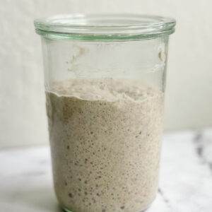 Day One: To a clean jar, add 100g whole rye flour and 125g warm water (about 95°F). Stir until fully combined and there are no dry bits. Loosely cover and let sit for 24 hours.