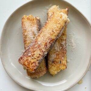 When cooking these French Toast Sticks, use the back of your tongs to slightly and gently flatten each side and you cook and flip – create four flat sides to your French toast stick. This helps you to be able to easily brown the entire outside of the rollup! (see the video for more).