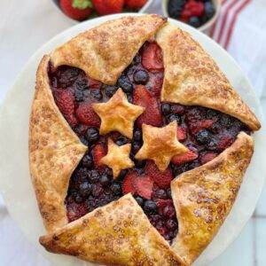 Galettes are free-form pies that are easy to put together with a variety of different fillings. This star shaped galette is made by trimming your pie crust with straight edges and slits to form a star when folded towards the center. Filled with an almond flavored pastry cream called frangipane and piled with loads of red and blue mixed berries. This star shaped red and blue galette is the perfect Fourth of July dessert!